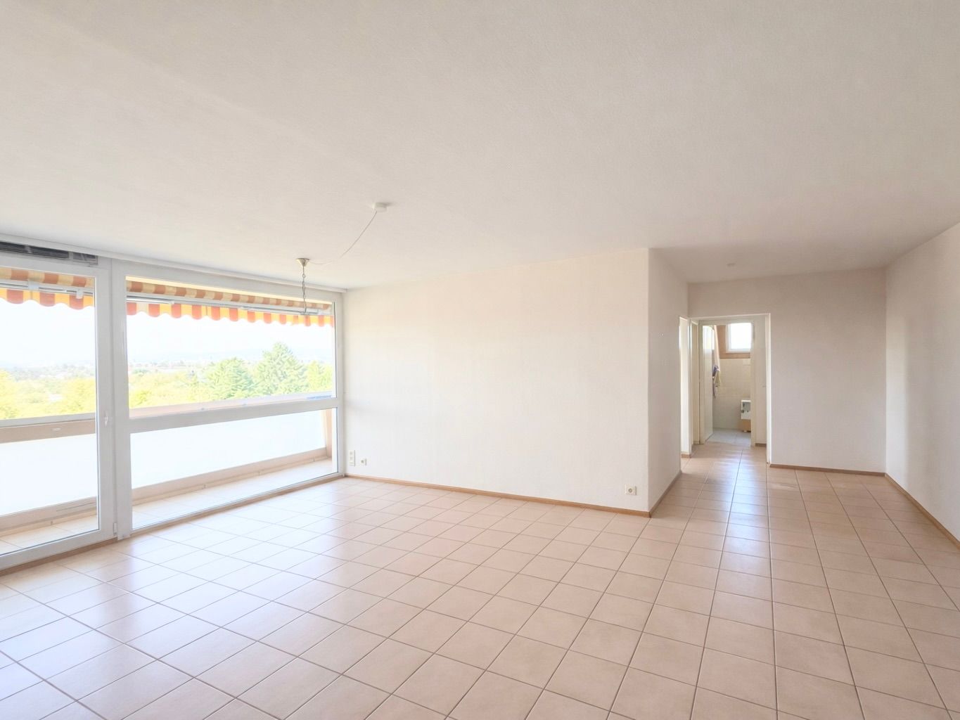 Das großzügige Wohnzimmer bietet viel Platz für entspannte Abende und gesellige Stunden und überzeugt zusätzlich mit einem direkten Zugang zum Balkon. Von hier aus genießen Sie einen schönen Blick Richtung Taunus, der für eine erholsame Atmosphäre sorgt. Der große Flur öffnet den Wohnbereich und verstärkt das luftige Raumgefühl der Wohnung.