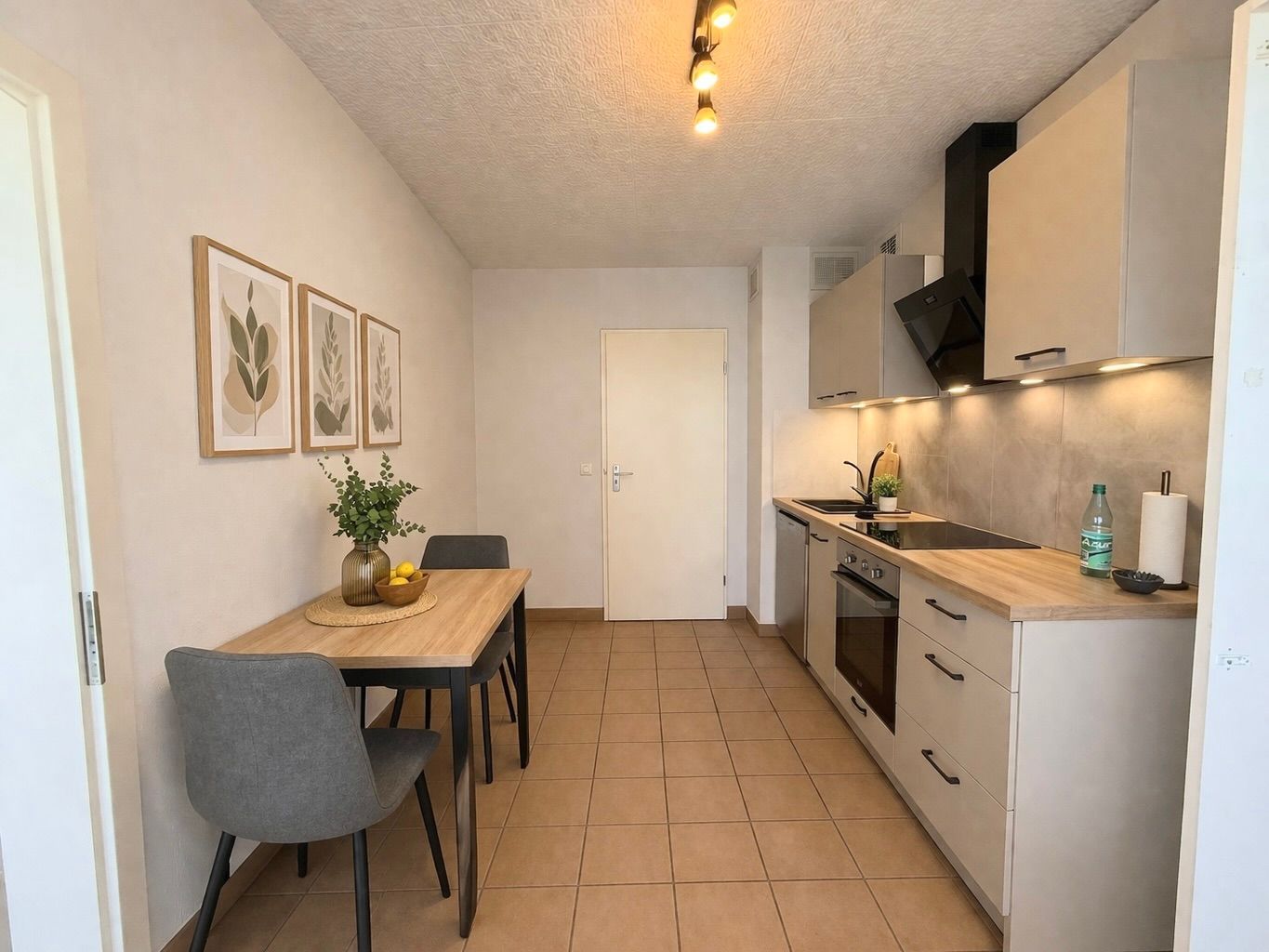 Die Küche ist von zwei Seiten begehbar, einmal vom Flur und einmal vom Wohnbereich, was für kurze Wege und ein offenes Wohngefühl sorgt.